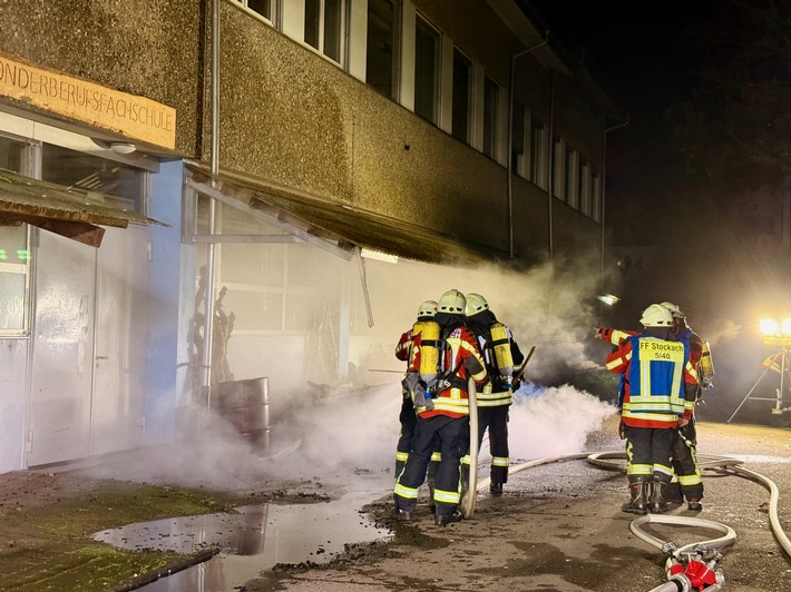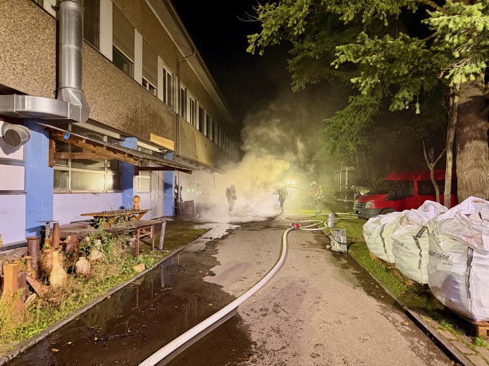 Beim Eintreffen der ersten Kräfte stand ein Materiallager in unmittelbarer Nähe des Gebäudes in Flammen. Durch das schnelle und gezielte Eingreifen konnte der Brand rasch unter Kontrolle gebracht und ein Übergreifen auf weitere Gebäudeteile verhindert werden. Die Einsatzstelle wurde weiträumig ausgeleuchtet, und das Gebäude wurde mittels Überdrucklüftern rauchfrei gemacht.