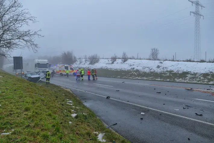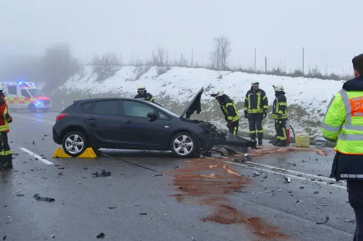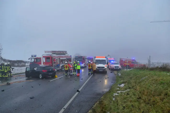 Bei Eintreffen der Feuerwehr wurde ein Verkehrsunfall frontal zwischen zwei PKW vorgefunden. Vier verletzte Personen wurden zusammen mit dem ebenfalls zeitgleich eintreffenden Rettungsdienst gesichtet und erstversorgt.