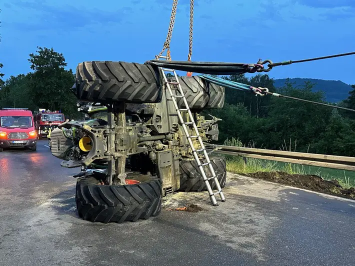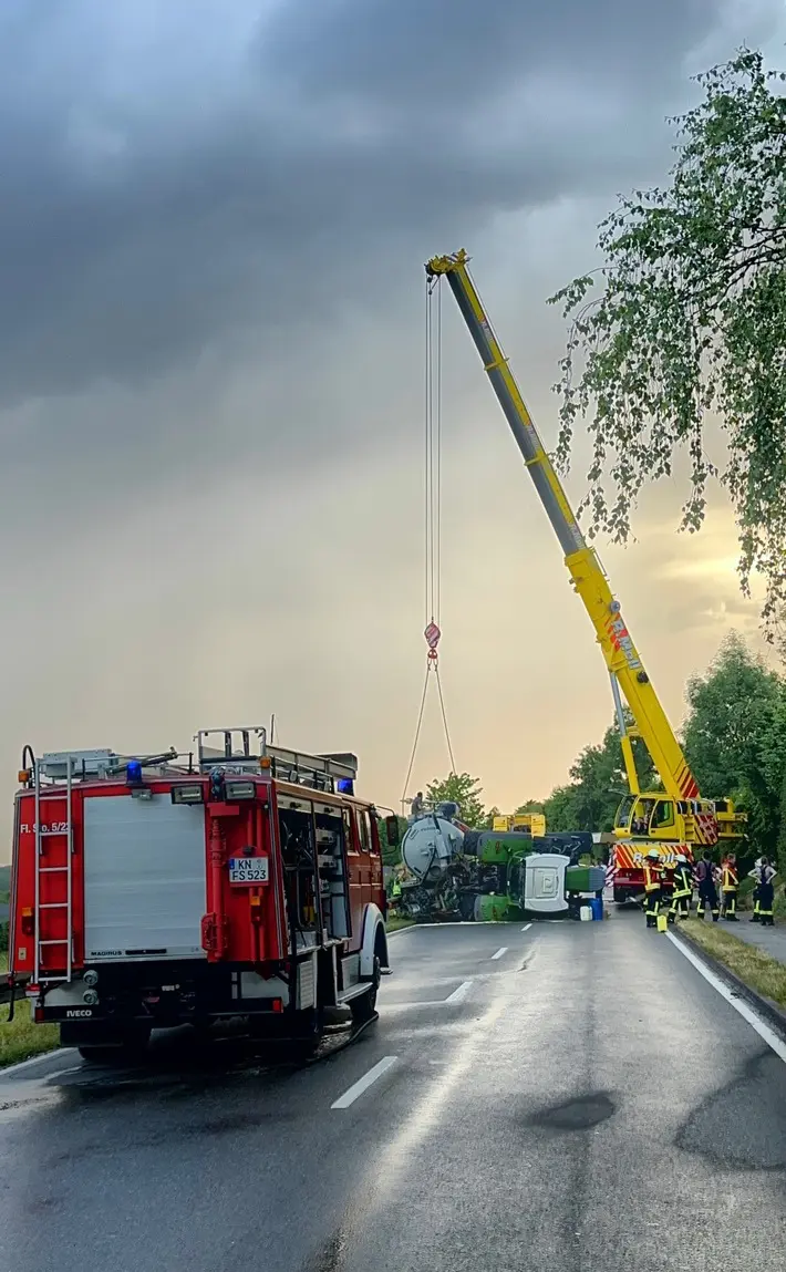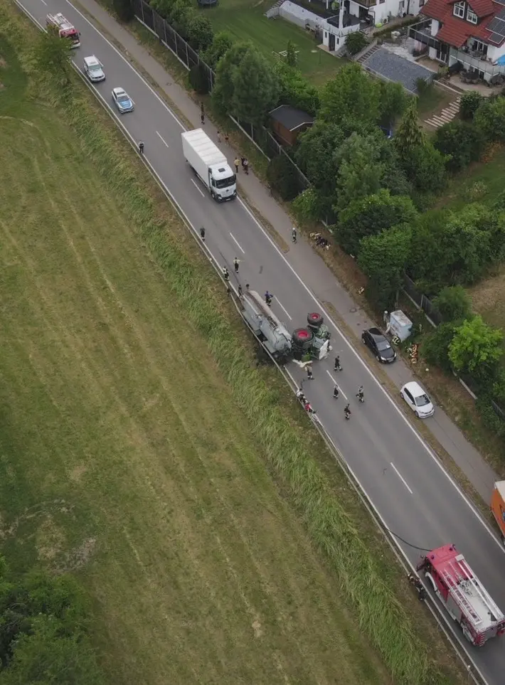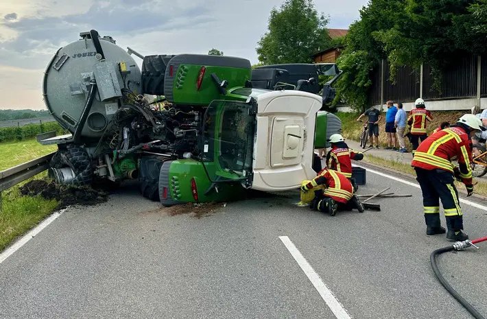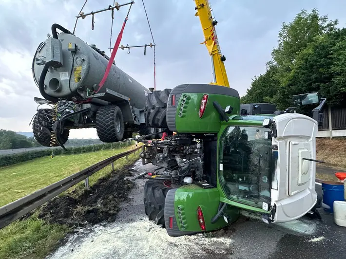 Bei einem von einer landwirtschaftlichen Zugmaschine gezogenen Jauchefass, das mit 27.000 Litern gefüllt war, war während der Fahrt aus noch ungeklärter Ursache mutmasslich ein Reifen geplatzt. Beim Eintreffen der Feuerwehr hing das Jauchefass in der Leitplanke und die Zugmaschine lag auf der Seite. Der Fahrer war glücklicherweise unverletzt und hatte sich selbständig aus dem Fahrzeug befreien können. Das Fahrzeug hatte nicht gebrannt.