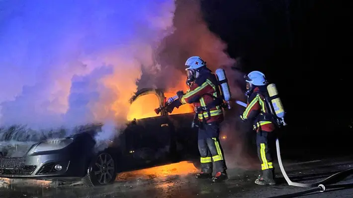 Mit dem Eintreffen der ersten Einsatzkräfte wurde die gemeldete Lage bestätigt und man fand ein PKW in Vollbrand vor.