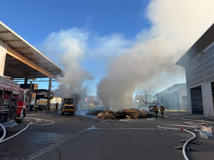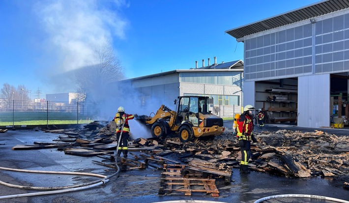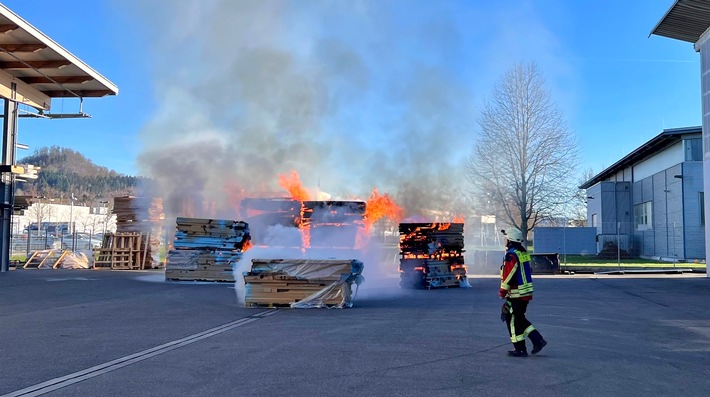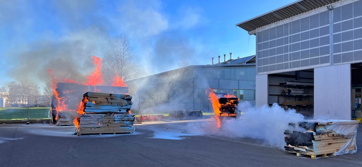 Beim Eintreffen der ersten Einsatzkräfte standen mehrere Stapel mit Dämmplatten im Hof der Firma im Vollbrand. Gebäude und Personen waren glücklicherweise nicht in direkter Gefahr.