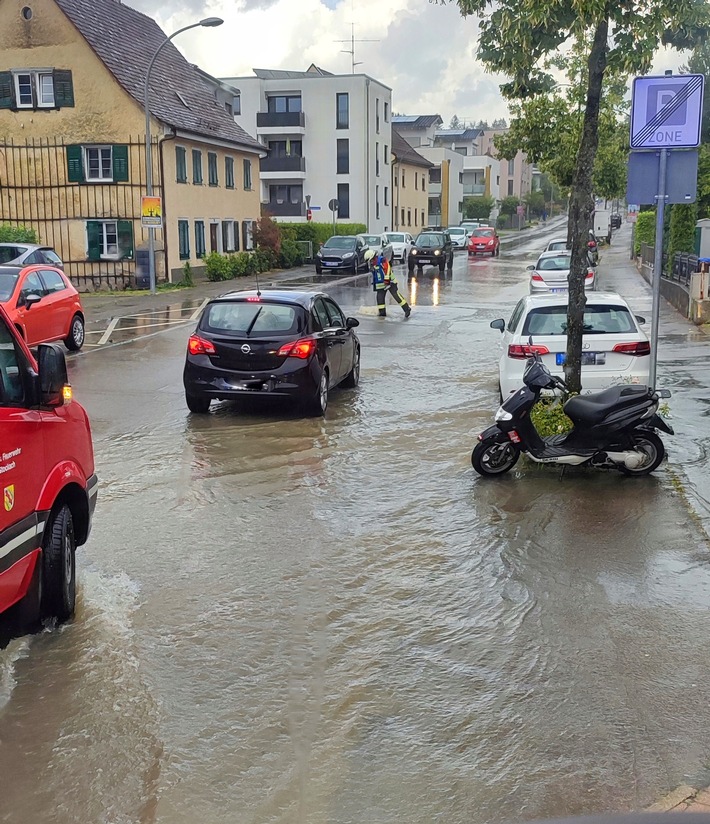 Noch während der Rückfahrt zog ein starkes Unwetter über das Stockacher Stadtgebiet. Die Leitstelle informierte die eingesetzten Fahrzeuge über mehrere überflutete Straßen und angehobene Kanaldeckel. Durch die eingesetzten Kräfte wurden umgehend zwei stark betroffene Einsatzstellen angefahren und die überfluteten Stellen begutachtet. Im Bereich Württembergerhofweg und im Bereich Zozneggerstraße kam es zu stark überfluteten Straßen und mehreren angehobenen Kanaldeckeln.